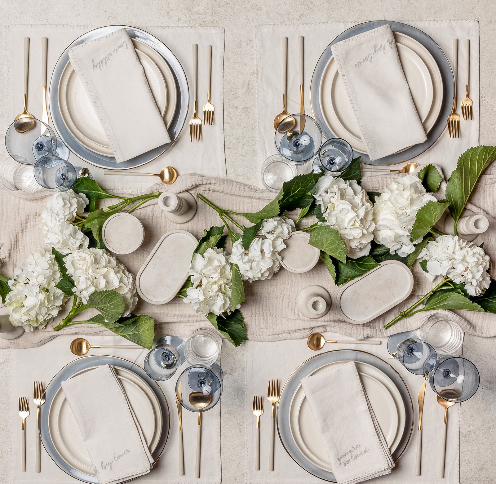 A whimsical statement for framing your plates, our smoky blue glass charger with a painted gold rim makes for a beautiful grounding layer at every place setting. Set of four.
