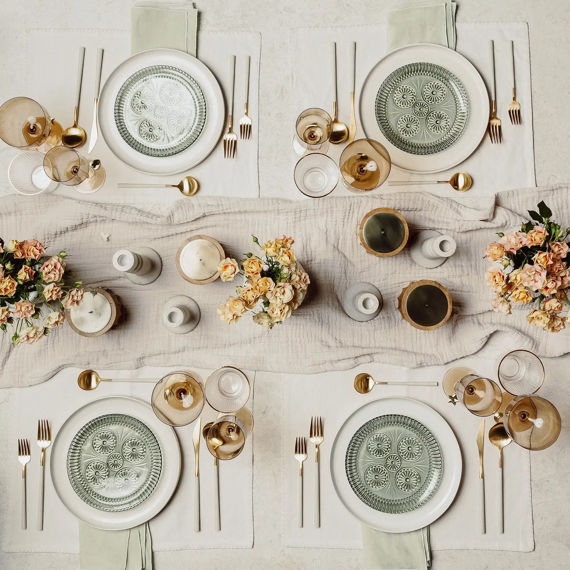 The ultimate delicate compilation of tinted pressed glass and smoky blown glass paired with natural materials like wood and stone in feminine (but not too sweet) silhouettes.