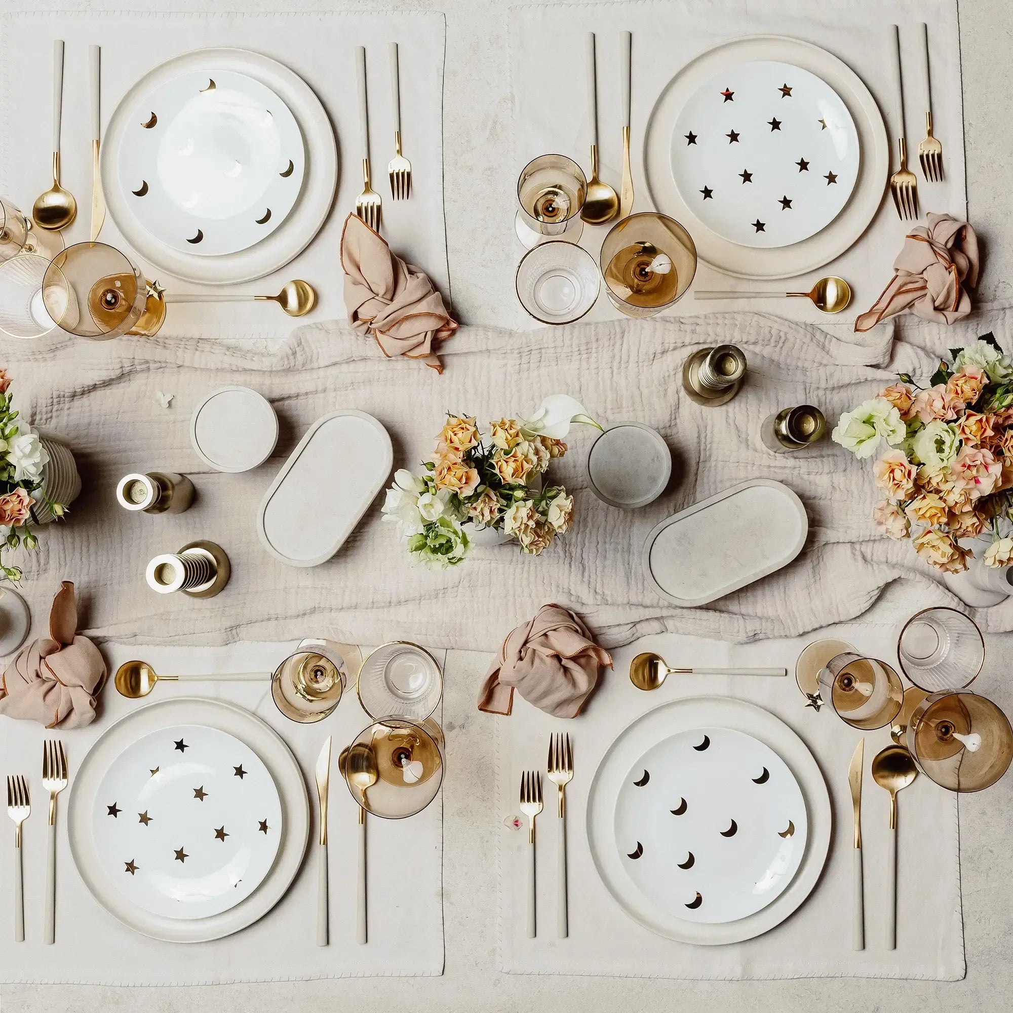 For the dreamer who believes in the power of the moon and the stars. Layered neutrals, delicate tinted glass, striking bone china and a touch of gold lends to a table full of wonder.