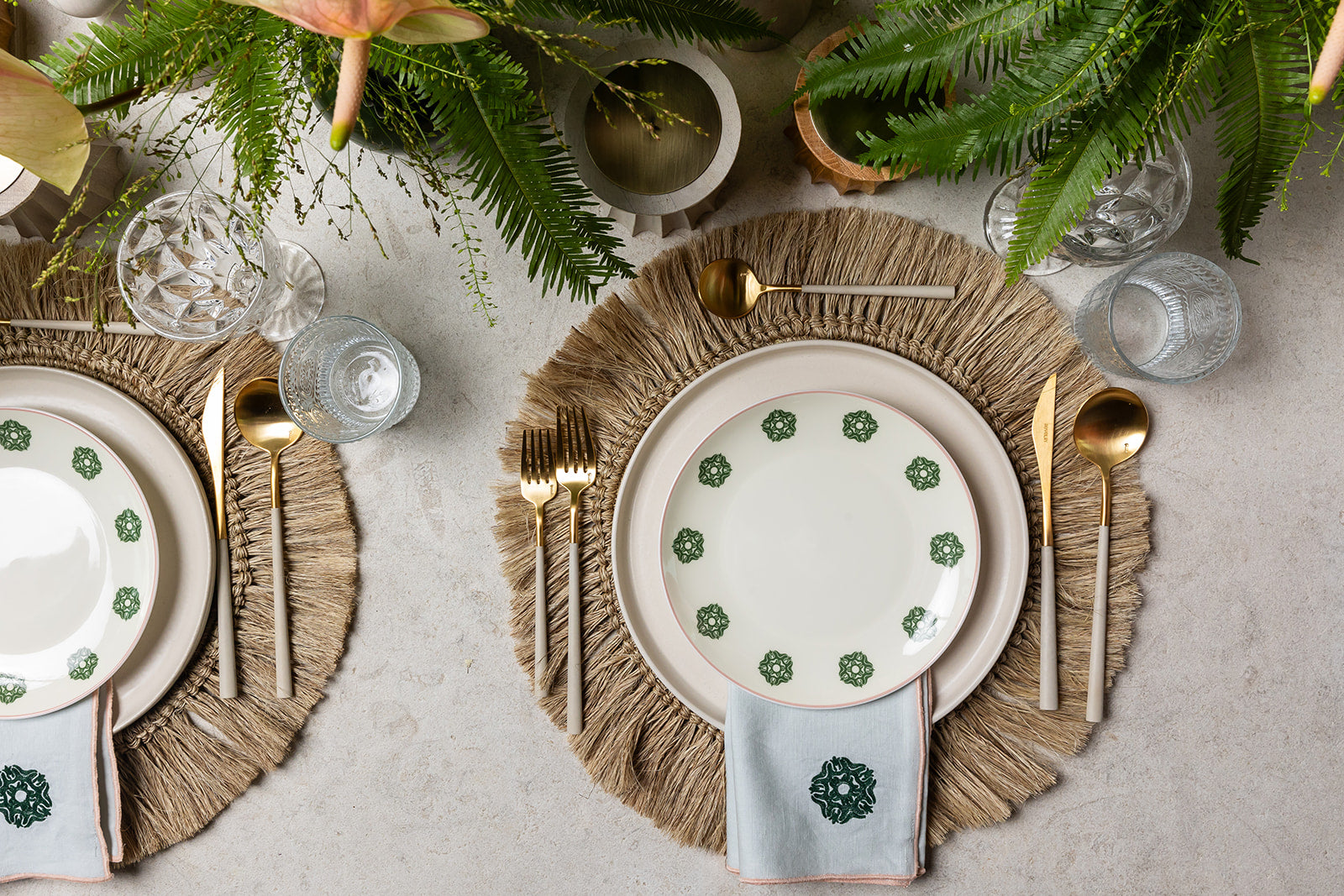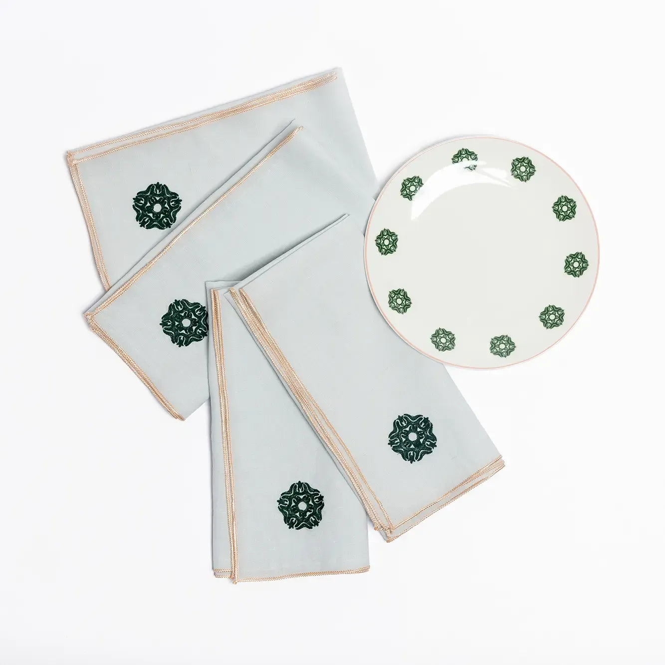 Soft and sophisticated, each barely blue cotton-linen napkin is embellished with a beautiful Hawaiian inspired motif and finished with a blush edge.